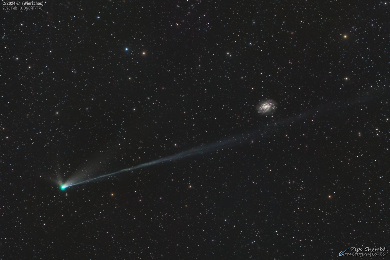 Explanation: Some comets are regular guests of our solar neighbourhood; others come by only once, never to return. We won’t have another chance to see Comet C/2024 E1 (Wierzchoś), which is currently making its way through the inner Solar System. The hyperbolic orbit of this comet indicates that it will likely become an interstellar traveler. Comet Wierzchoś is today near its closest approach to the Earth, passing roughly the same distance from the Earth as is the Sun. The featured 30-minute exposure was taken last week in Chile and shows a 5-degree long ion tail as well as three shorter dust tails. The green hue of the coma comes from the breakdown of dicarbon molecules by sunlight, but that process does not last long enough to also tinge the tails. On the far right lies a spiral galaxy far in the distance: NGC 300.