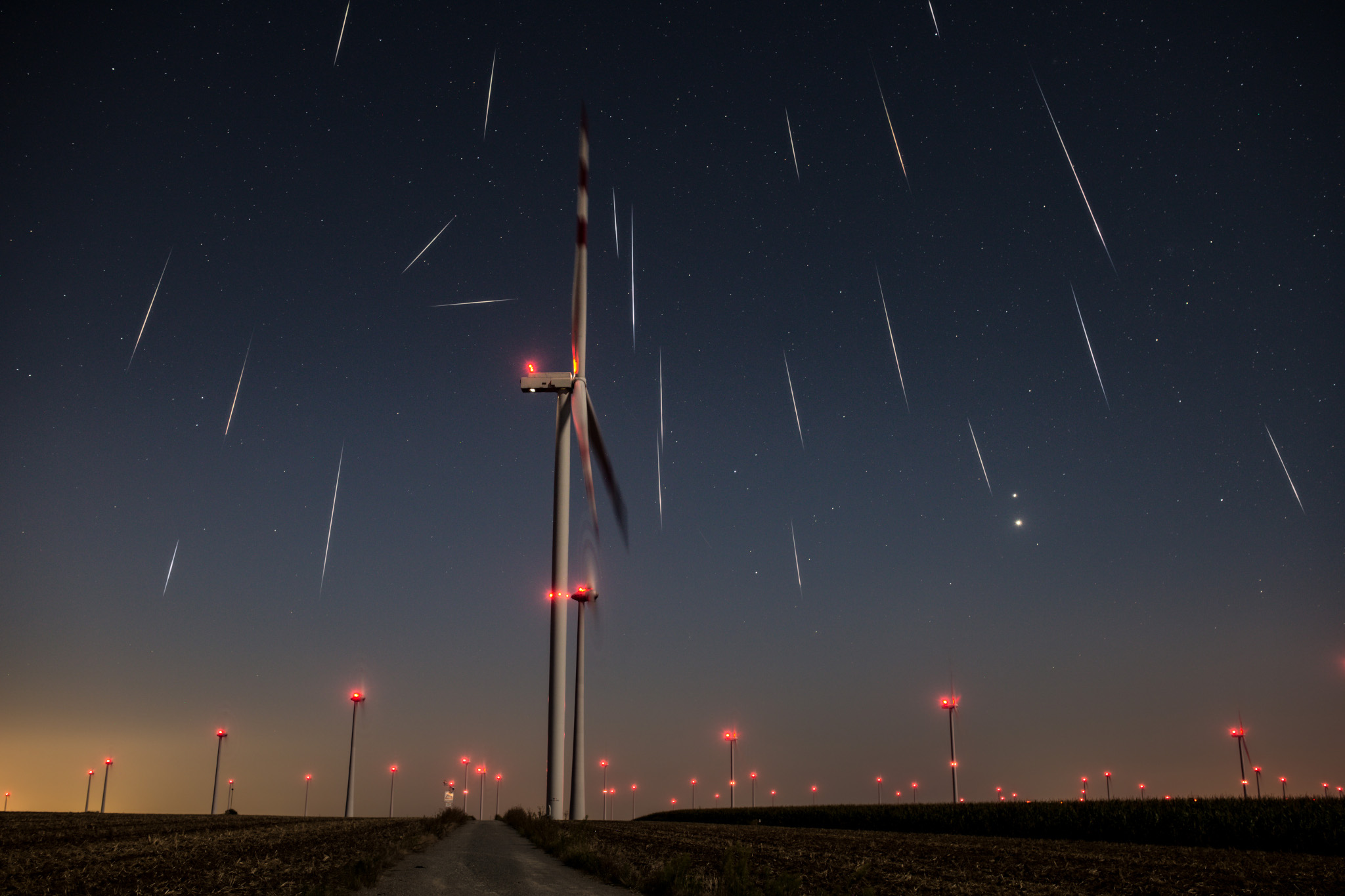 Explanation: In this predawn skyscape recorded during the early morning hours of August 13, mostly Perseid meteors are raining down on planet Earth. You can easily identify the Perseid meteor streaks. They're the ones with trails that seem to converge on the annual meteor shower's radiant, a spot in the heroic constellation Perseus, located off the top of the frame. That's the direction in Earth's sky that looks along the orbit of this meteor shower's parent, periodic Comet Swift-Tuttle. Of course the scene is a composite, a combination of about 500 digital exposures to capture meteors registered with a single base frame exposure. But all exposures were taken during a period of around 2.5 hours from a wind farm near Mönchhof, Burgenland, Austria. Red lights on the individual wind turbine towers dot the foreground. In their spectacular close conjunction, bright planets Jupiter and Venus are poised above the eastern horizon.